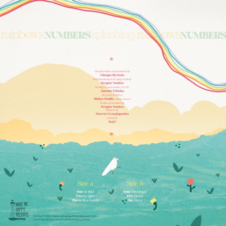 Σήμερα έχω τη μεγάλη χαρά να σας ανακοινώσω την κυκλοφορία του πρώτου μου προσωπικού δίσκου, δηλαδή όχι ως μέλους ενός συγκροτήματος, όπως στην περίπτωση των One Night Suzan, αλλά ως αυτόνομου «δημιουργού» (λέξη πολλαπλά παρεξηγημένη, εξ ου και τα εισαγωγικά), έστω και με όνομα που παραπέμπει σε συγκρότημα: Splashing Rainbows. Ο δίσκος (με τίτλο Numbers) περιέχει έξι τραγούδια, με αγγλικό στίχο, συνολικής διάρκειας 16 λεπτών. Πρόκειται, δηλαδή, για αυτό που τα παλιά τα χρόνια αποκαλούσαμε EP (extended play). Είναι ένα 12ιντσο βινύλιο, σε πορτοκαλί χρώμα, που παίζει στις 45 στροφές. Τα τραγούδια, παρότι είναι μάλλον παλιομοδίτικου ύφους, θυμίζοντας τη δεκαετία του 1960 (ίσως και λίγο 1970), γράφτηκαν το 2019 και ηχογραφήθηκαν το 2020 στο στούντιο της ΔΙΣΚΕΞ, υπό το άγρυπνο αυτί του παραγωγού Σέργιου Βούδρη (ψυχής των The Voyage Limpid Sound). Το ύφος τους κινείται κάπου ανάμεσα στην indie-pop, την progressive pop, την psychedelic pop και την art-pop (ώρες-ώρες αυτοί οι όροι παραείναι μπερδεμένοι, αλλά τέλος πάντων), και ακούγοντάς τα πιθανότατα θα αποκαλυφθούν στα αυτιά σας αναφορές στους Beatles, τους Beach Boys, τους XTC, τον Peter Hammill και τον Elvis Costello, ή και σε άλλους καλλιτέχνες που δεν μου πέρασαν καν από το μυαλό κατά τη δημιουργία αυτού του δίσκου.